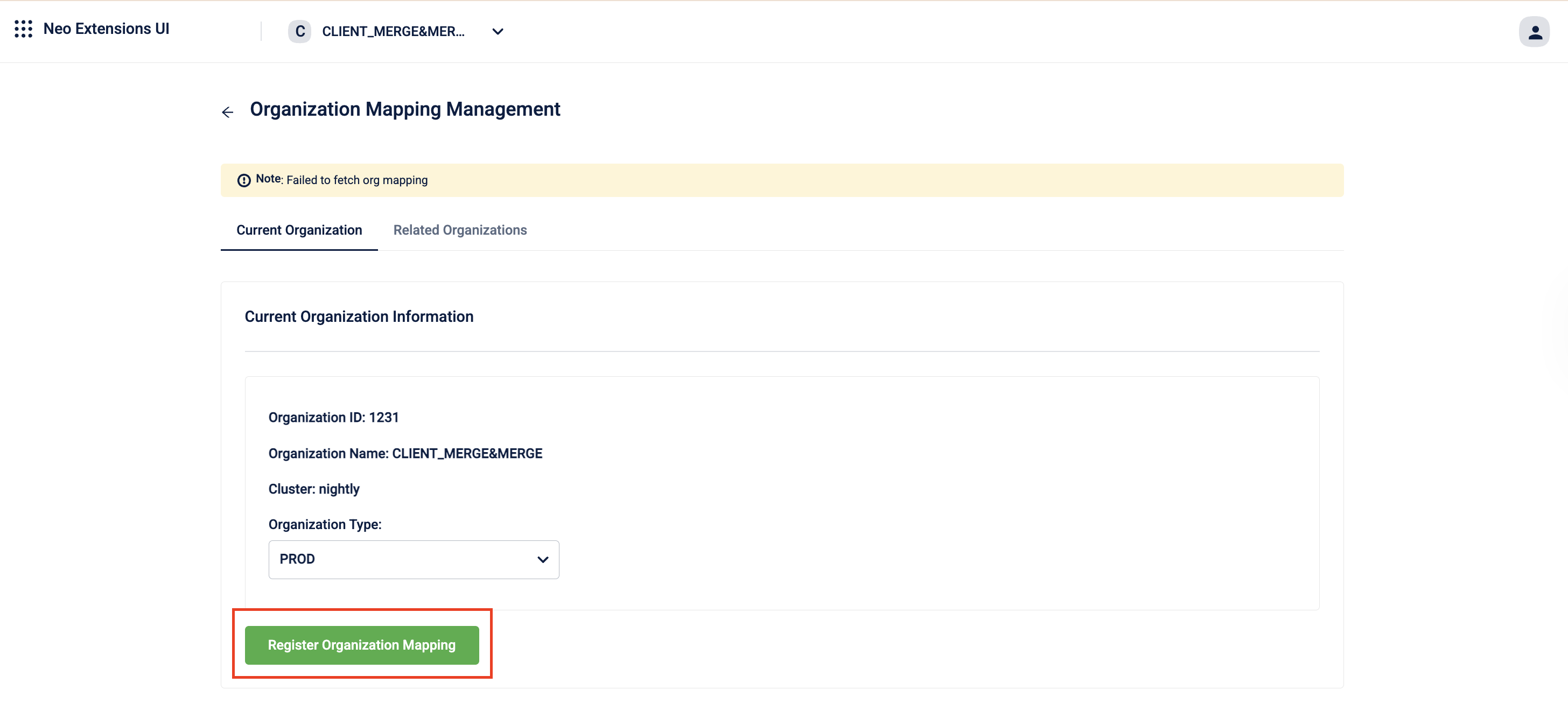 An organization with Neo enabled must still be explicitly registered on this page. Until it is registered, Neo does not recognize the organization for promotion, and you see an error when you attempt to add a mapping that includes it.