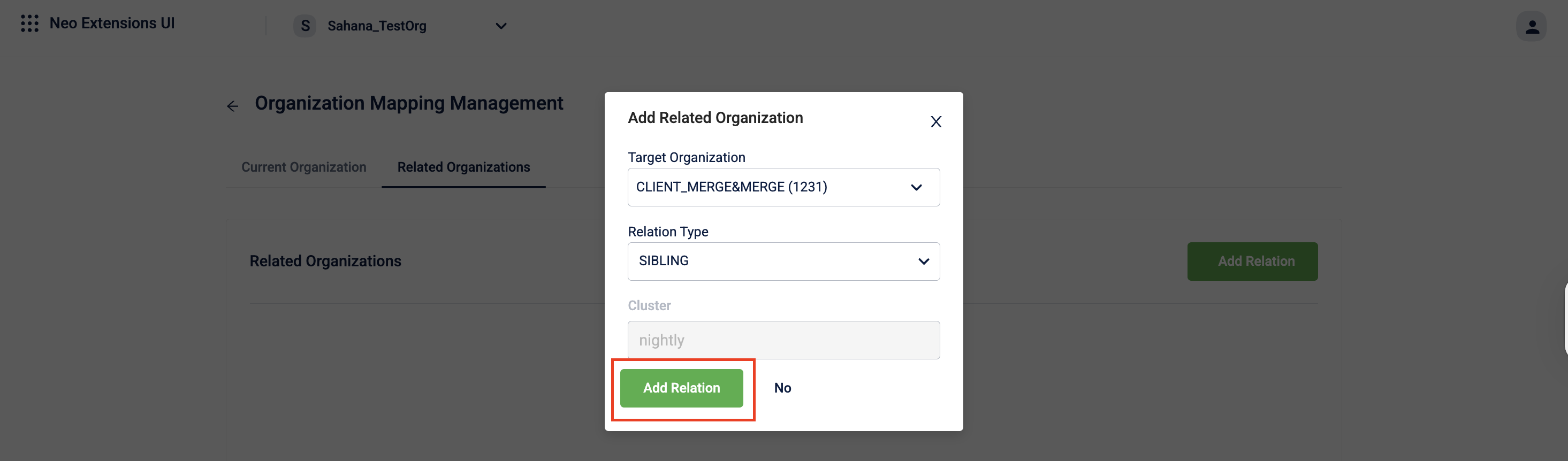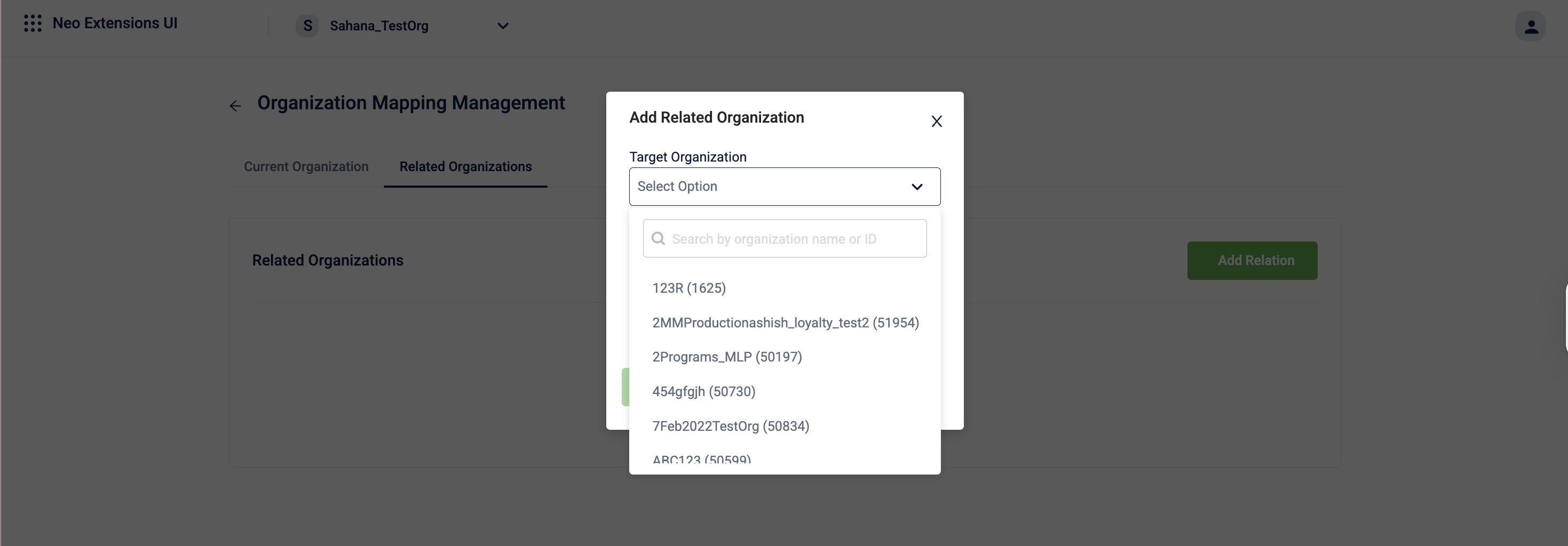 Select the Target Organization from the drop-down. Note: If the target organization is not yet registered with Neo or does not have Neo enabled, an error appears. Register the target organization first before adding the mapping.