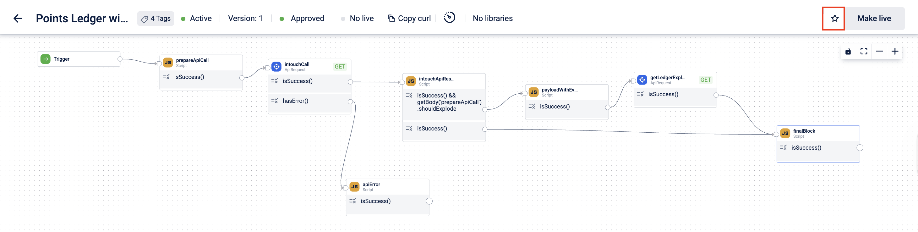 The promoted dataflow retains the same trigger URL, HTTP method, block structure, block configurations, and headers from the source.