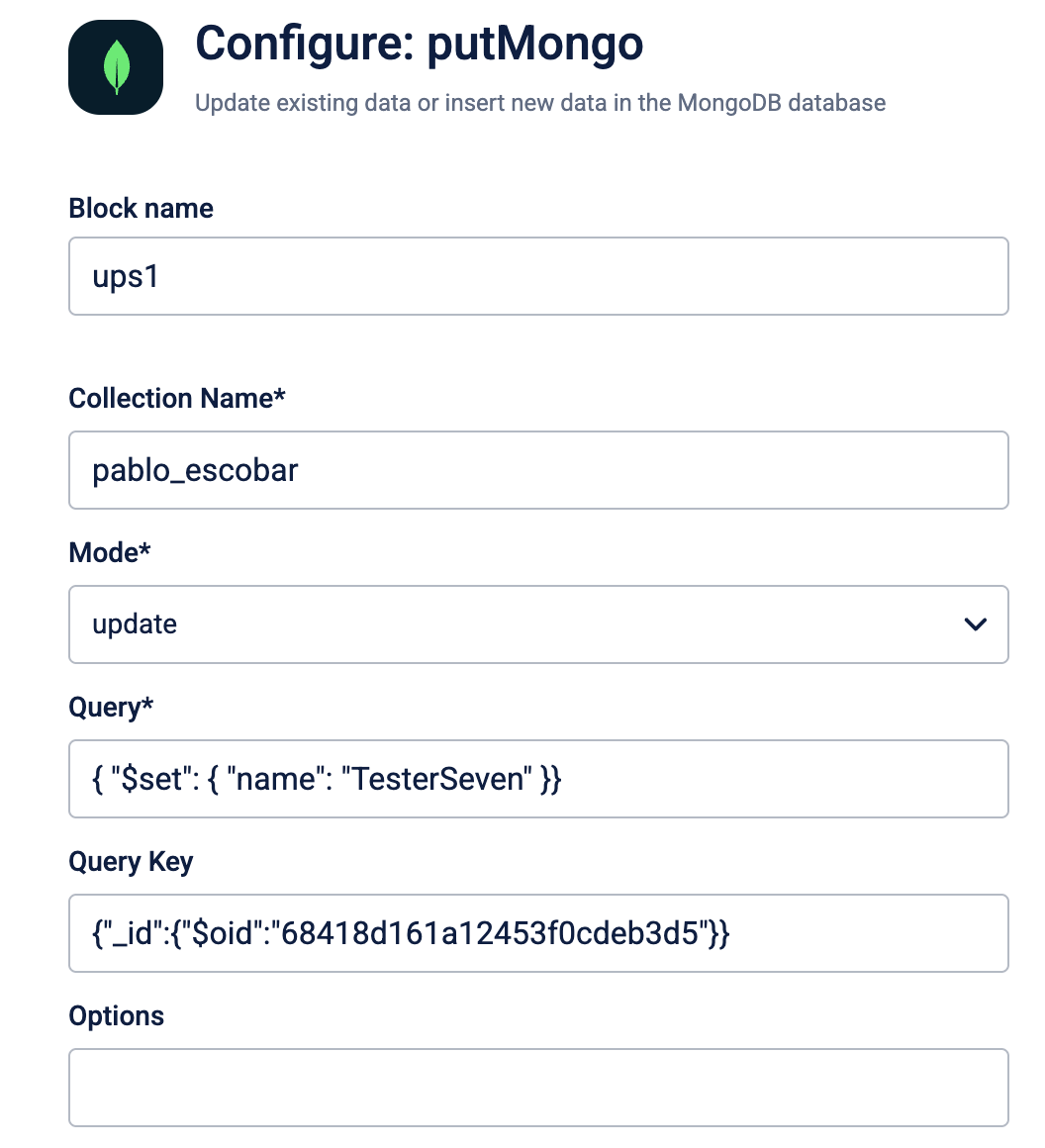 - (Optional) In the Query Key field, specify the key used to perform the update. The key identifies the specific record in the database that needs to be updated. You can also use EJSON format for complex data types.