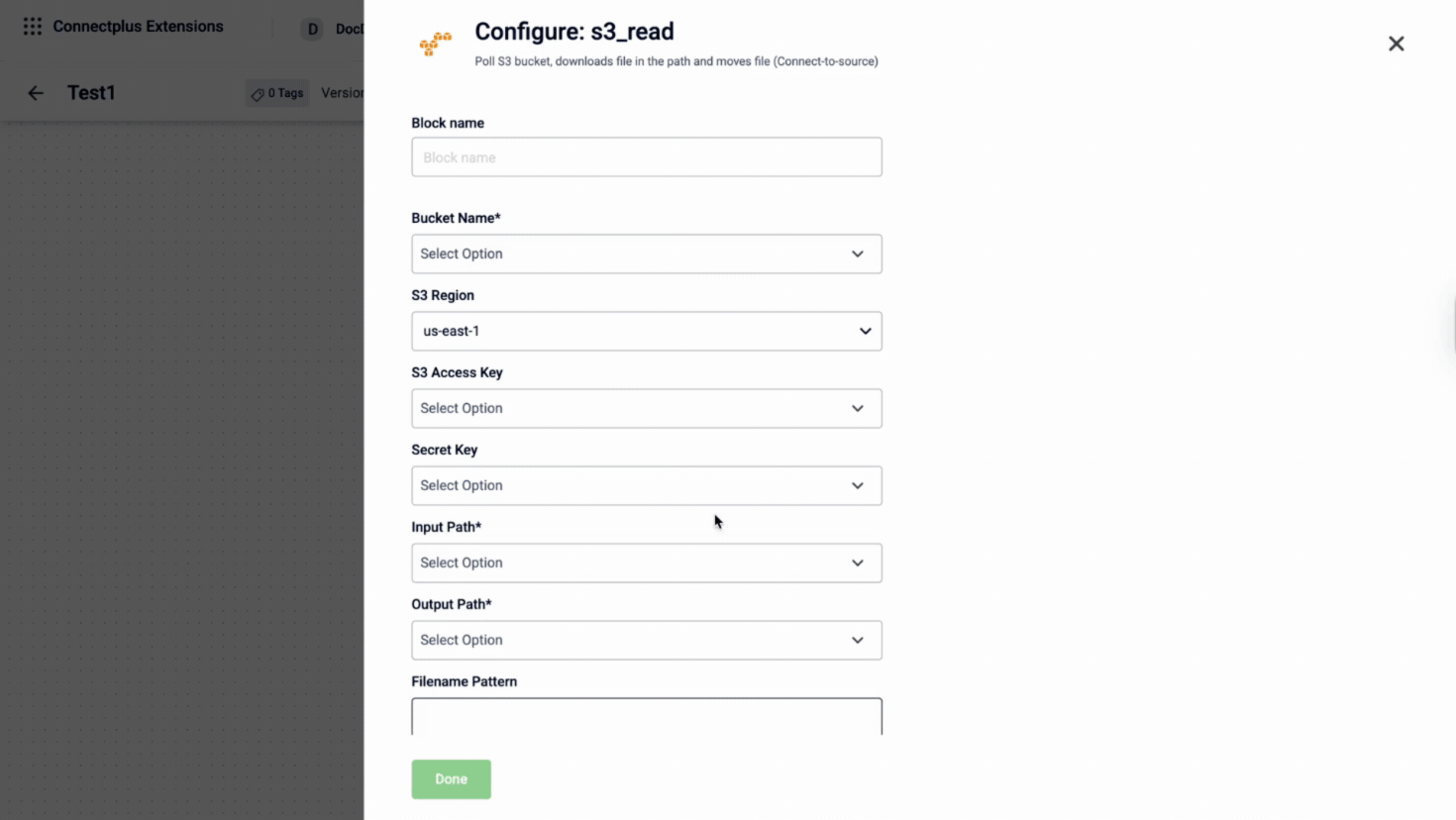 The s3_read block retrieves files from an Amazon S3 bucket and brings them into your Connect+ dataflow for processing. It acts as the source or Connect to Source block in a Connect+ dataflow. It uses AWS credentials to connect to the specified bucket, picks up files matching a defined filename pattern, and moves them to an output path once downloaded. Any errors that occur during processing are written to a designated error file path for review.
