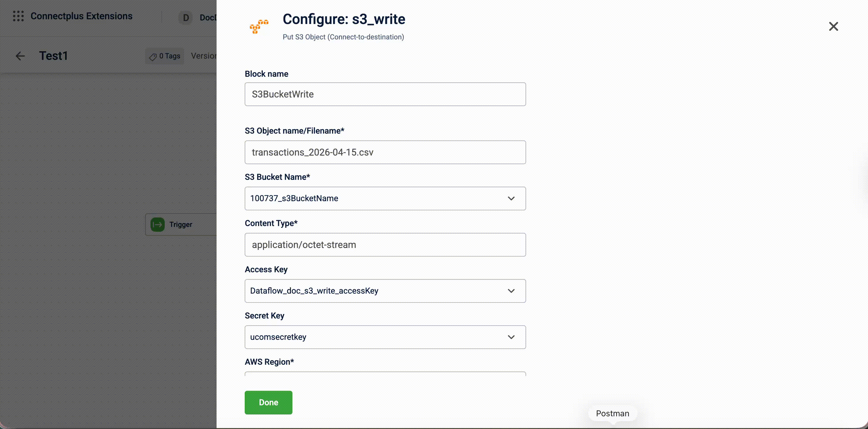 The s3_write block puts an S3 object, writing processed files to a destination Amazon S3 bucket. It acts as the destination block in a Connect+ dataflow, receiving output from upstream blocks and uploading the resulting file to a specified S3 bucket using AWS credentials. The block supports configurable content types, AWS credential-based authentication, and an optional AWS Credentials Provider service for internal authentication.