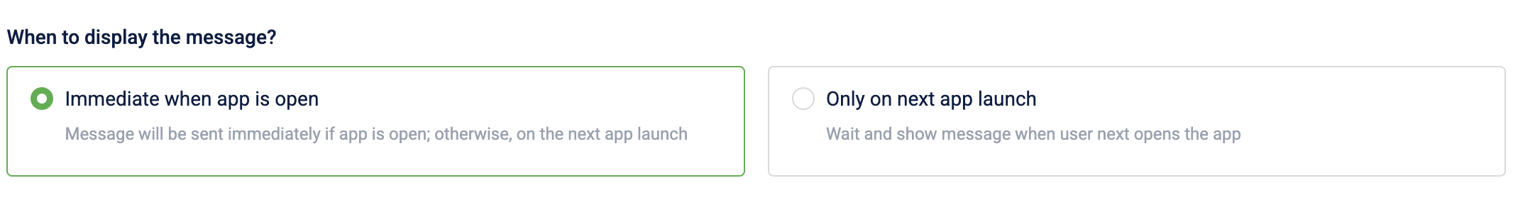 Only on next app launch: Sends the message to you only when you next open the app. Use this option for messages such as new user greetings, feature announcements, onboarding tips, and other non-urgent updates.