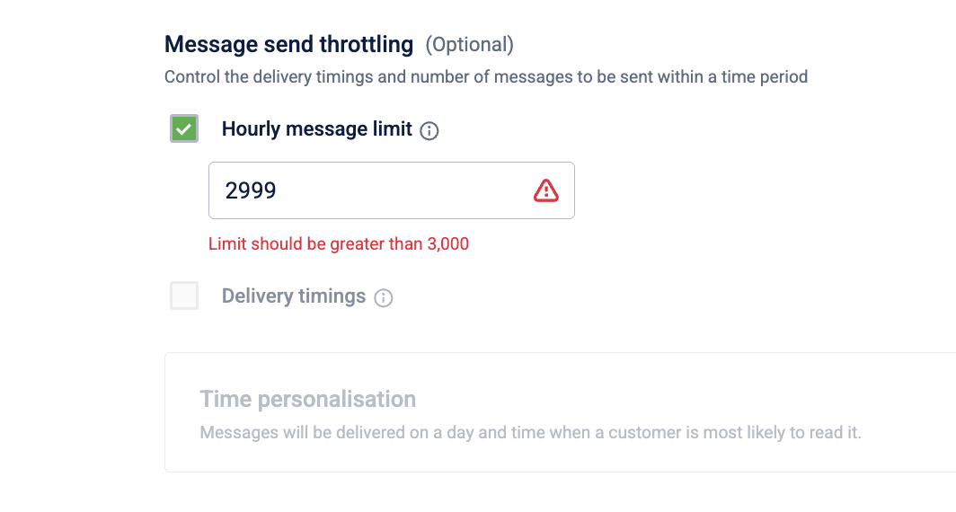 - In the Message Throttle Settings section, click Hourly Message Limit and enter a value. If you enter a value below 3,000, a validation message appears.