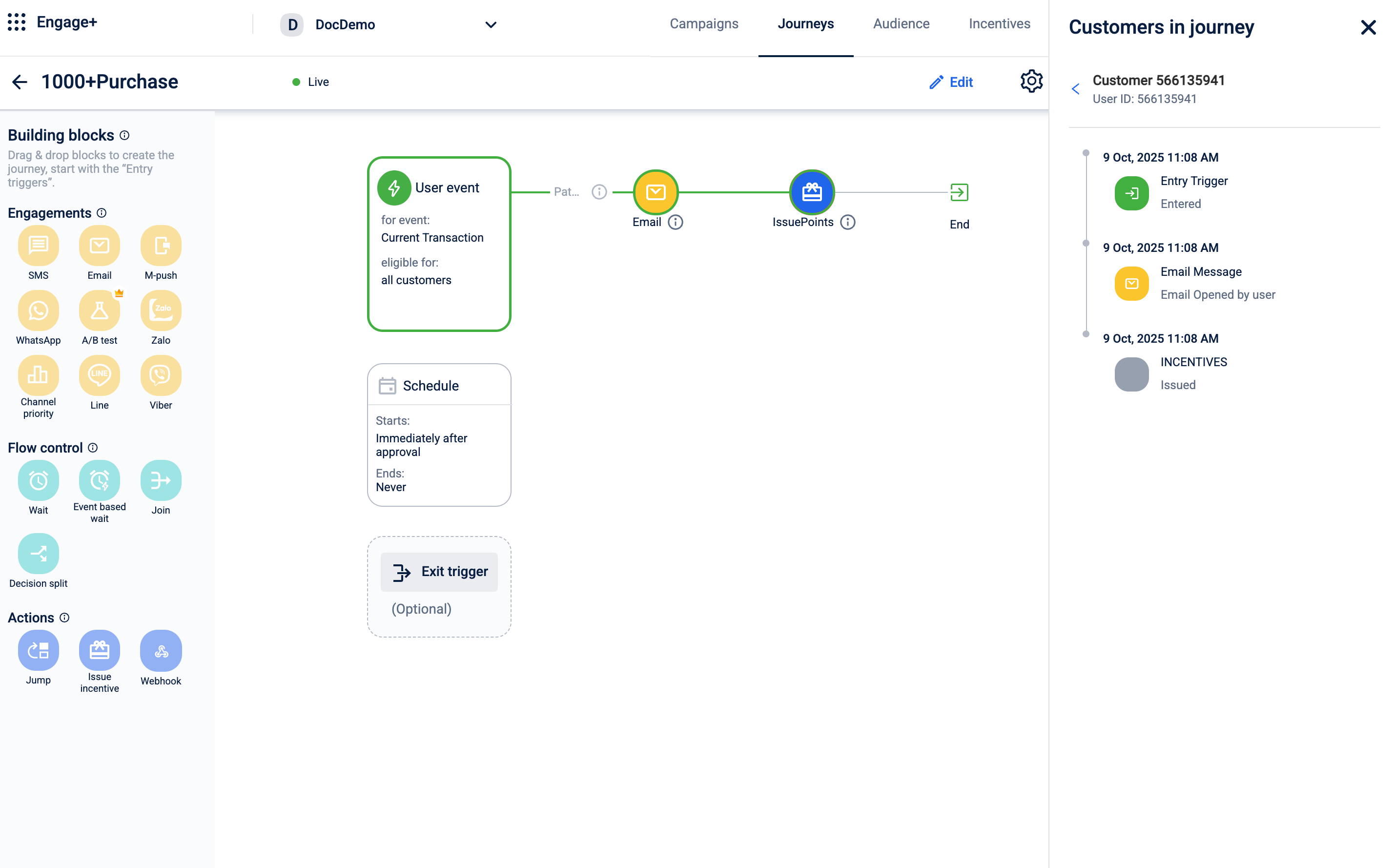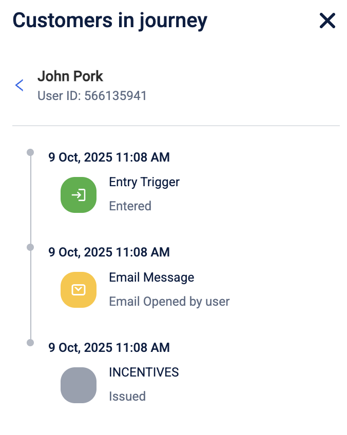 The Journey History feature enables you to search for a customer who entered a journey and provides a detailed, real-time log of a specific customer's path through a journey. You can use this to see exactly when a customer entered each step, what actions occurred, and where they are in the process. This helps you monitor customer progression in real time, troubleshoot issues for individuals, and analyse the journey's performance.