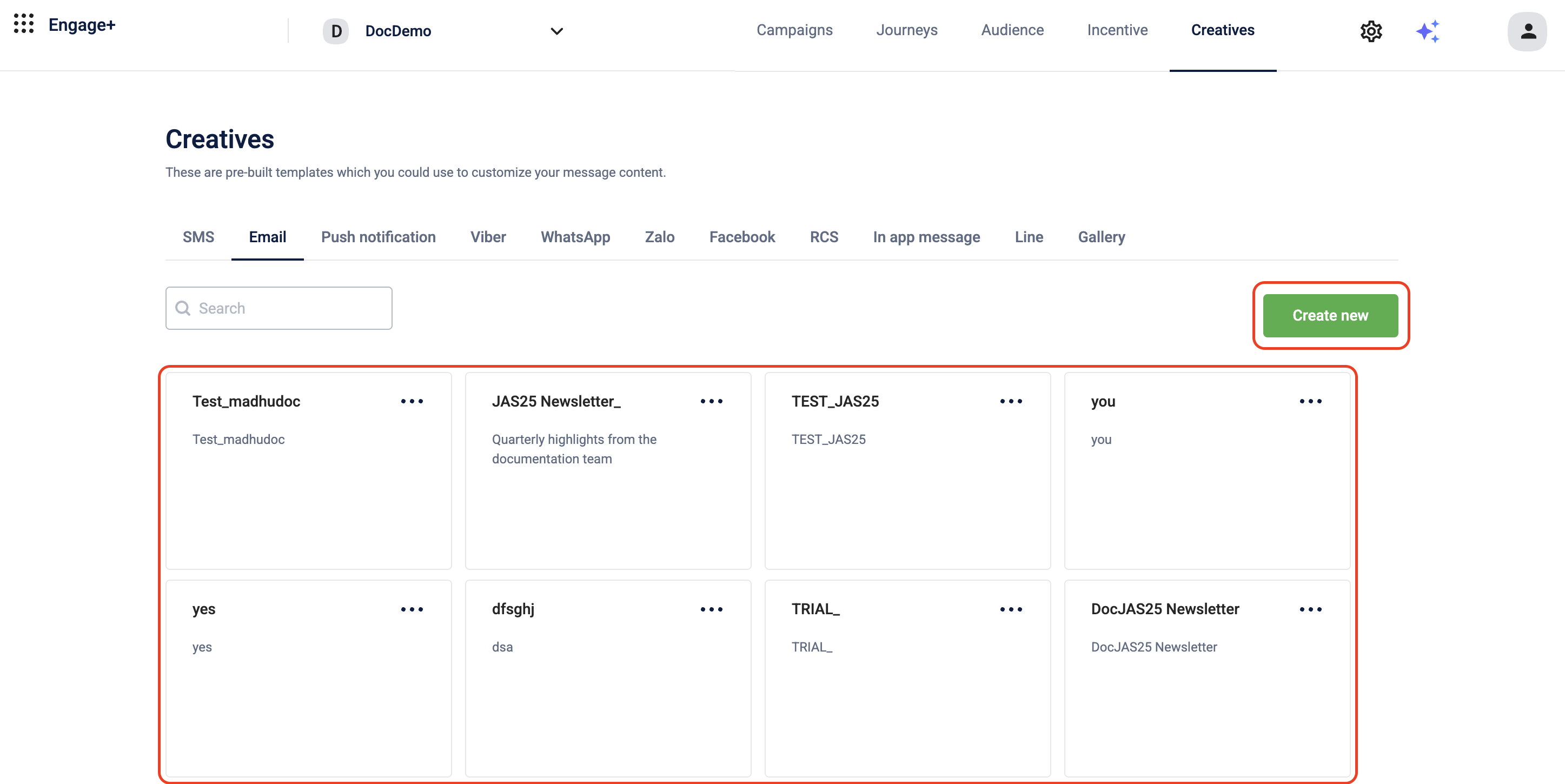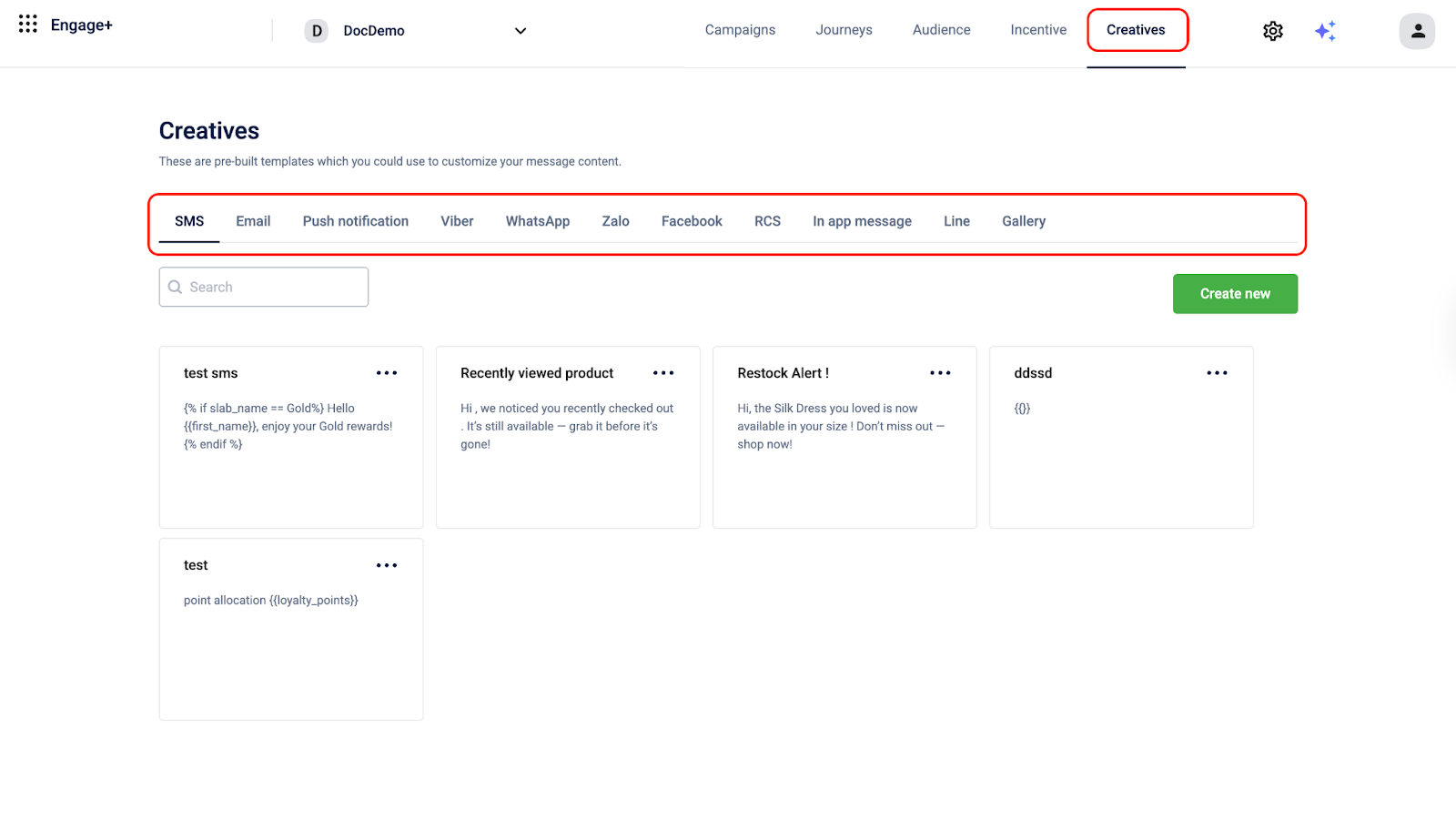 - From the Engage+ homepage, navigate to the Creative section and select the required engagement channel to preview and test the message content.