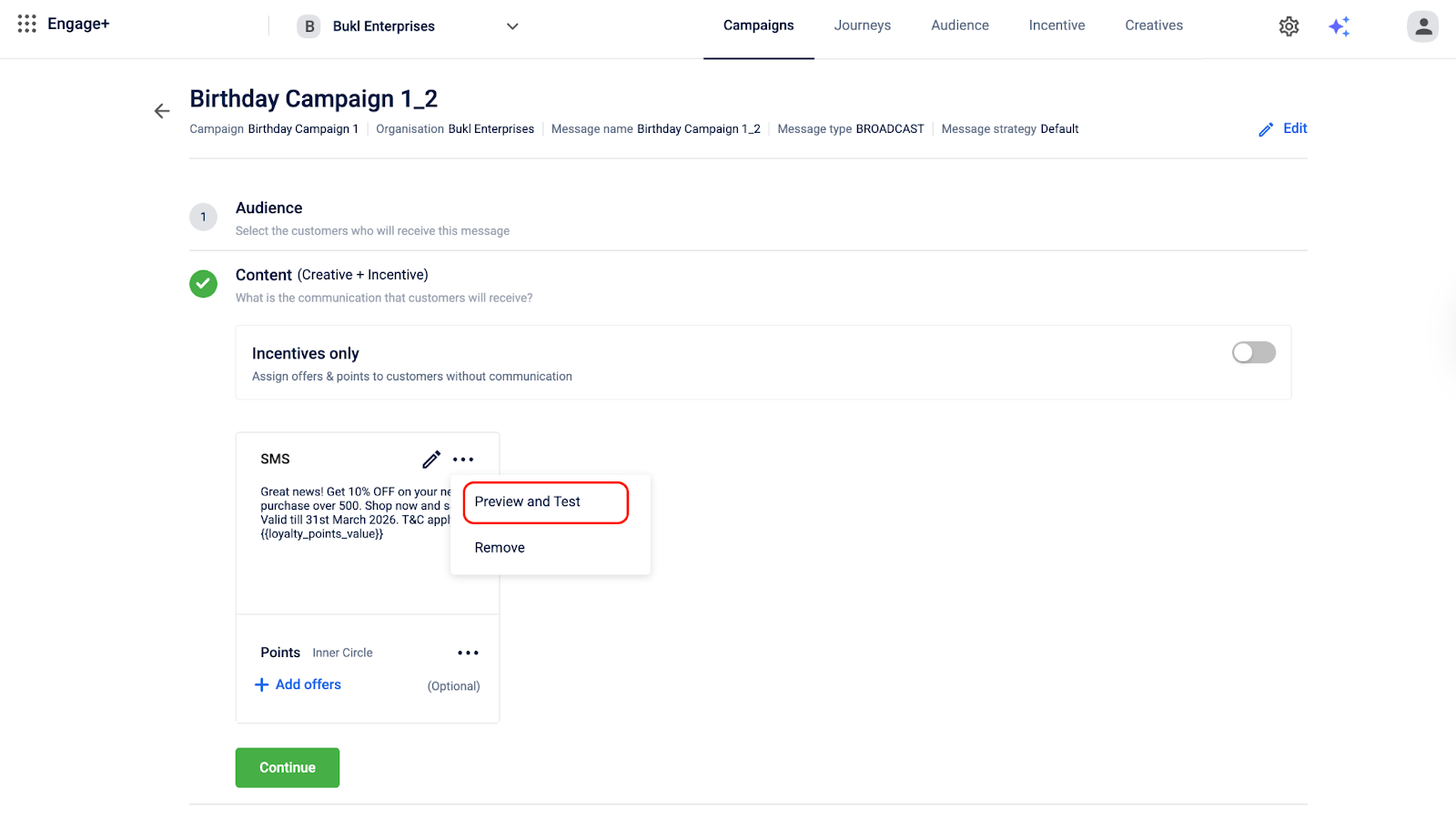 - Select the required engagement channel to preview and test the message content from the creatives.