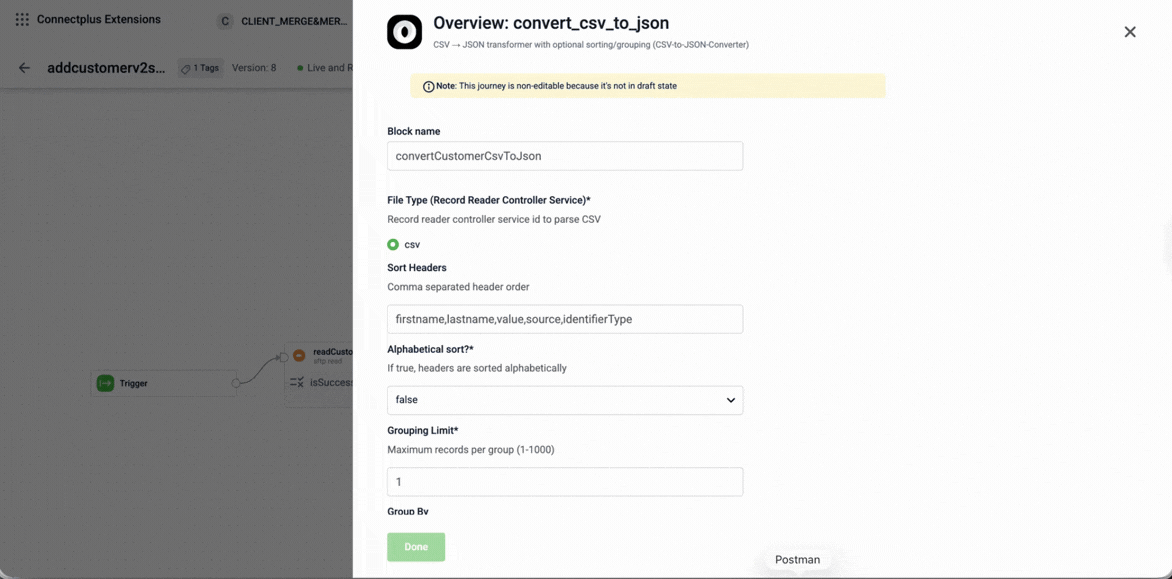 The convert_csv_to_json block transforms CSV files into JSON format with optional sorting and grouping. It acts as a transformation block in a Connect+ dataflow, sitting between the source and destination blocks to convert ingested CSV data into structured JSON. The block supports header-based sorting, alphabetical ordering, record grouping by a specified field, and configurable grouping limits to manage payload size for downstream processing.