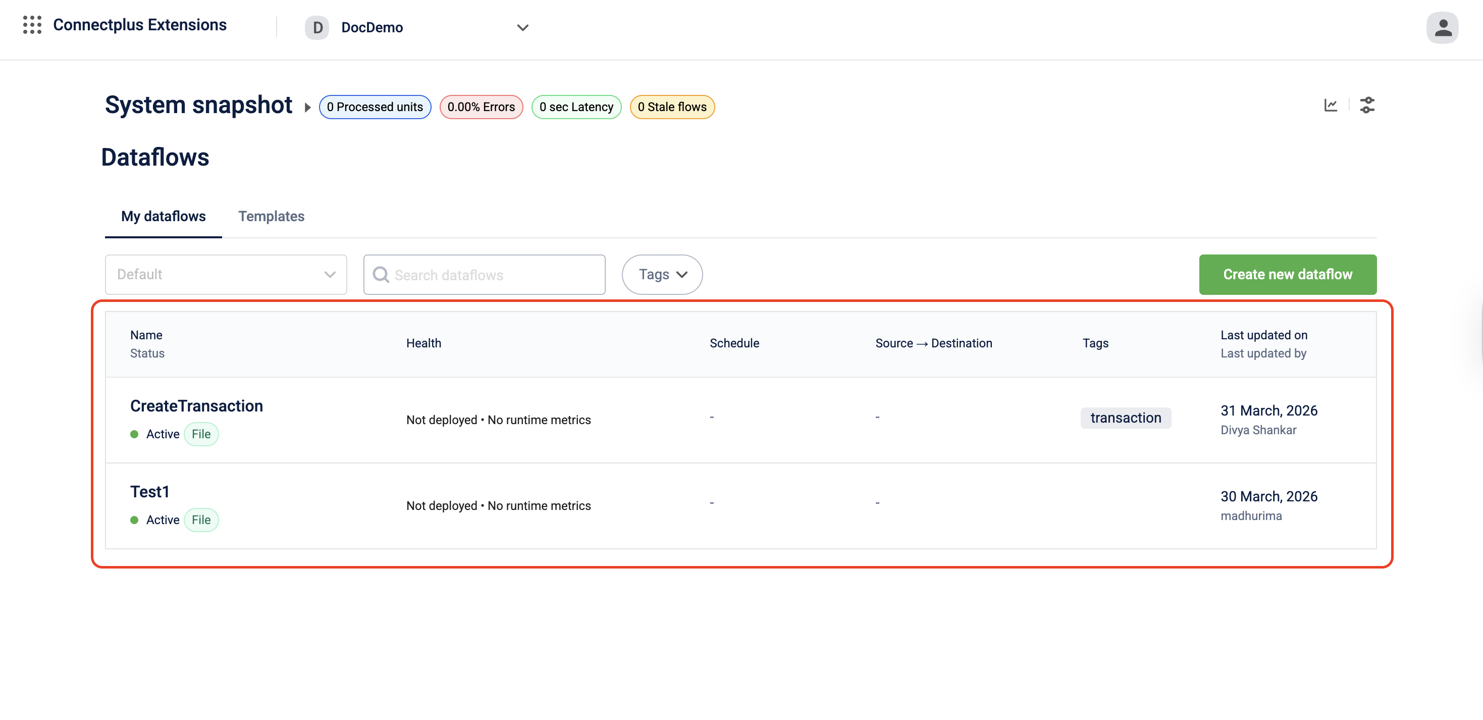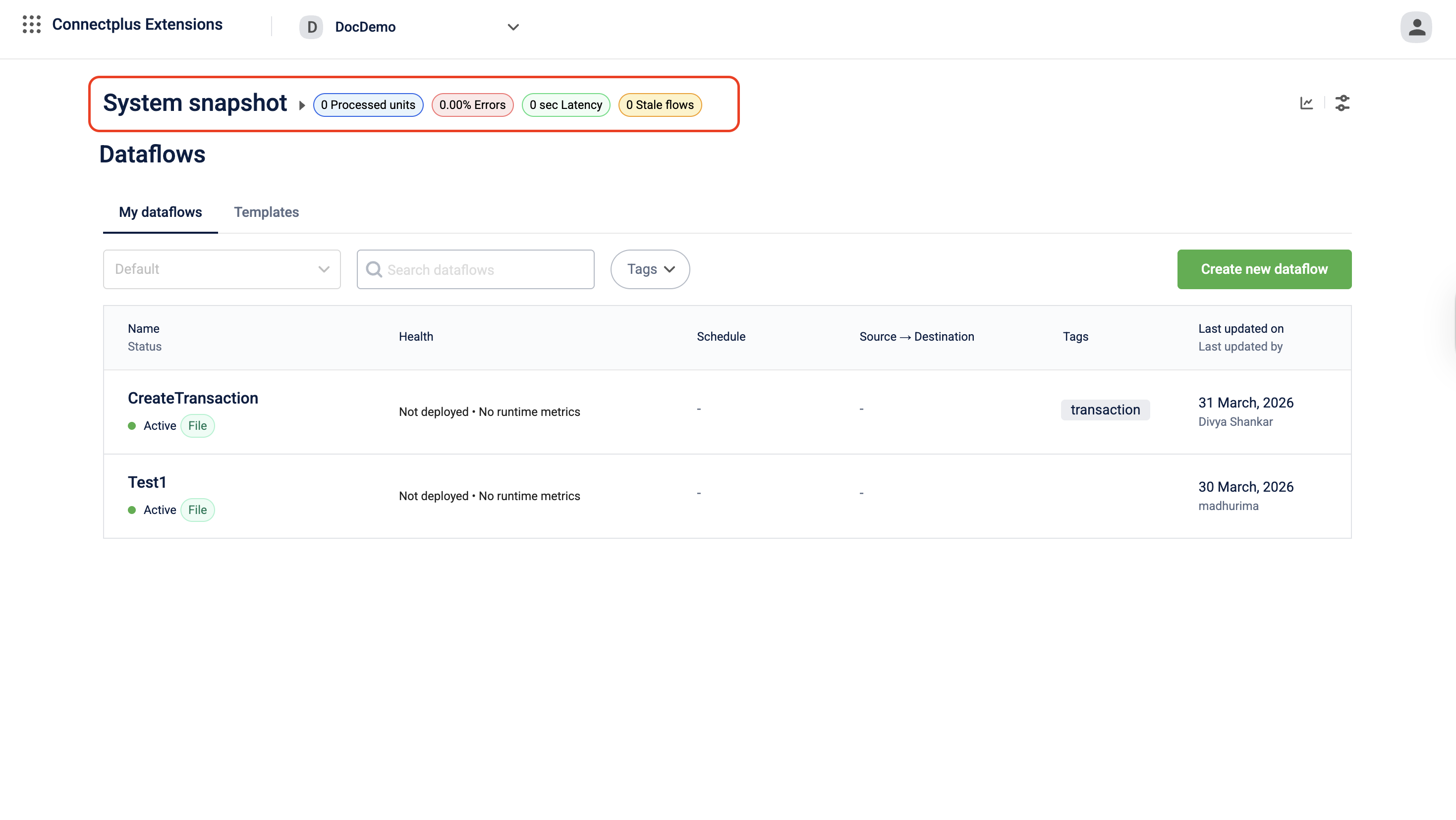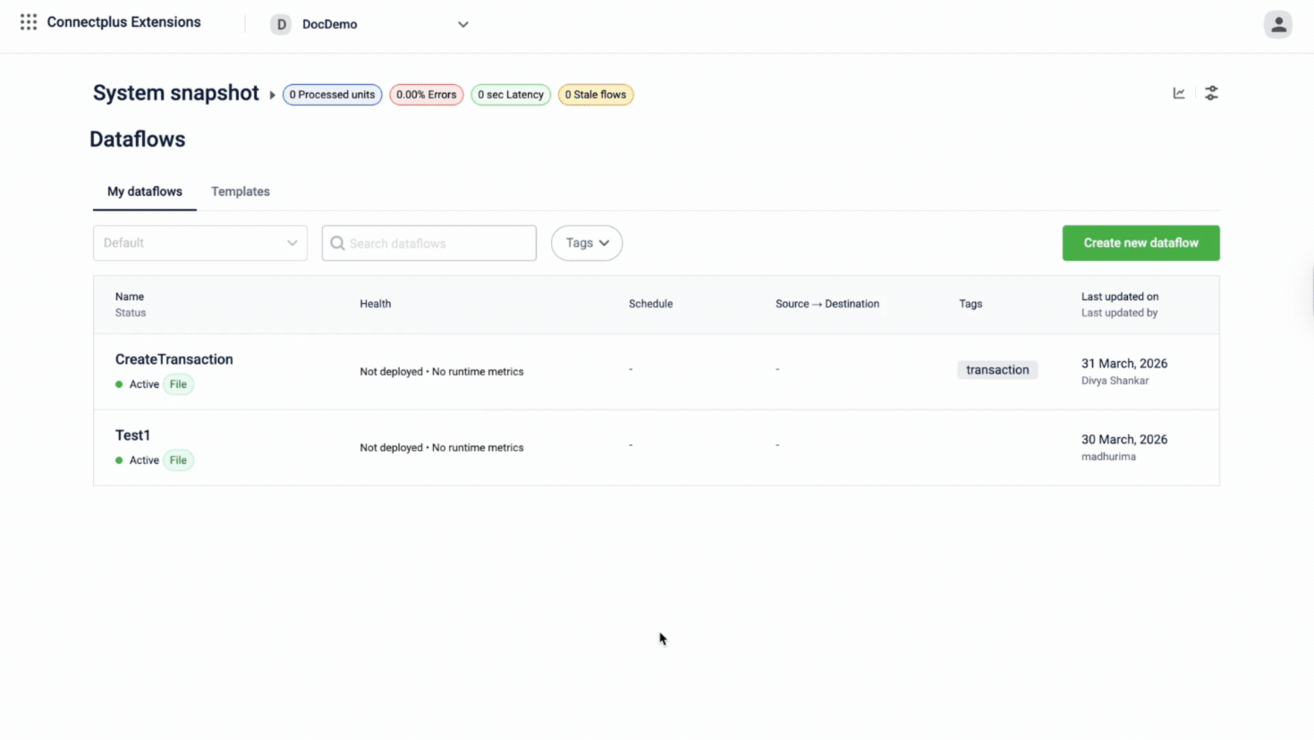 | Source → Destination | The type of source the dataflow reads from and the type of destination it writes to, for example, Sftp Read → Http Write or Kafka Topic Read → Kafka Topic Read. Displays a dash when the dataflow has no source or destination configured. |