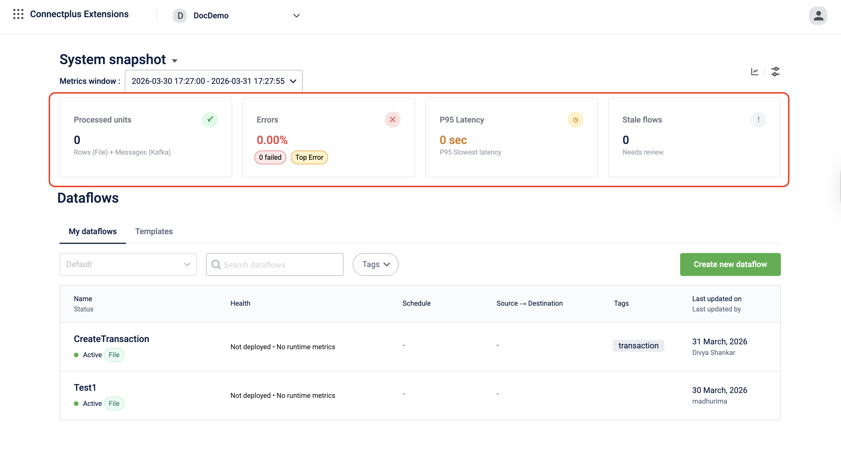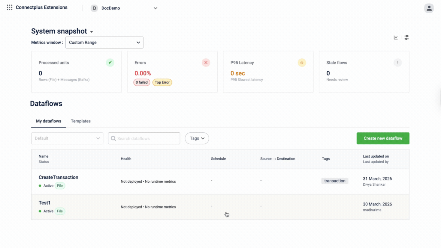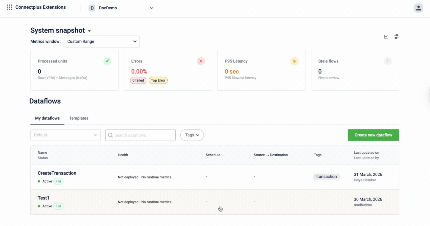The Connect+ homepage serves as the main interface for managing and monitoring all your dataflows. It provides a real-time overview of your workspace’s health at the top, followed by a comprehensive list of all dataflows.