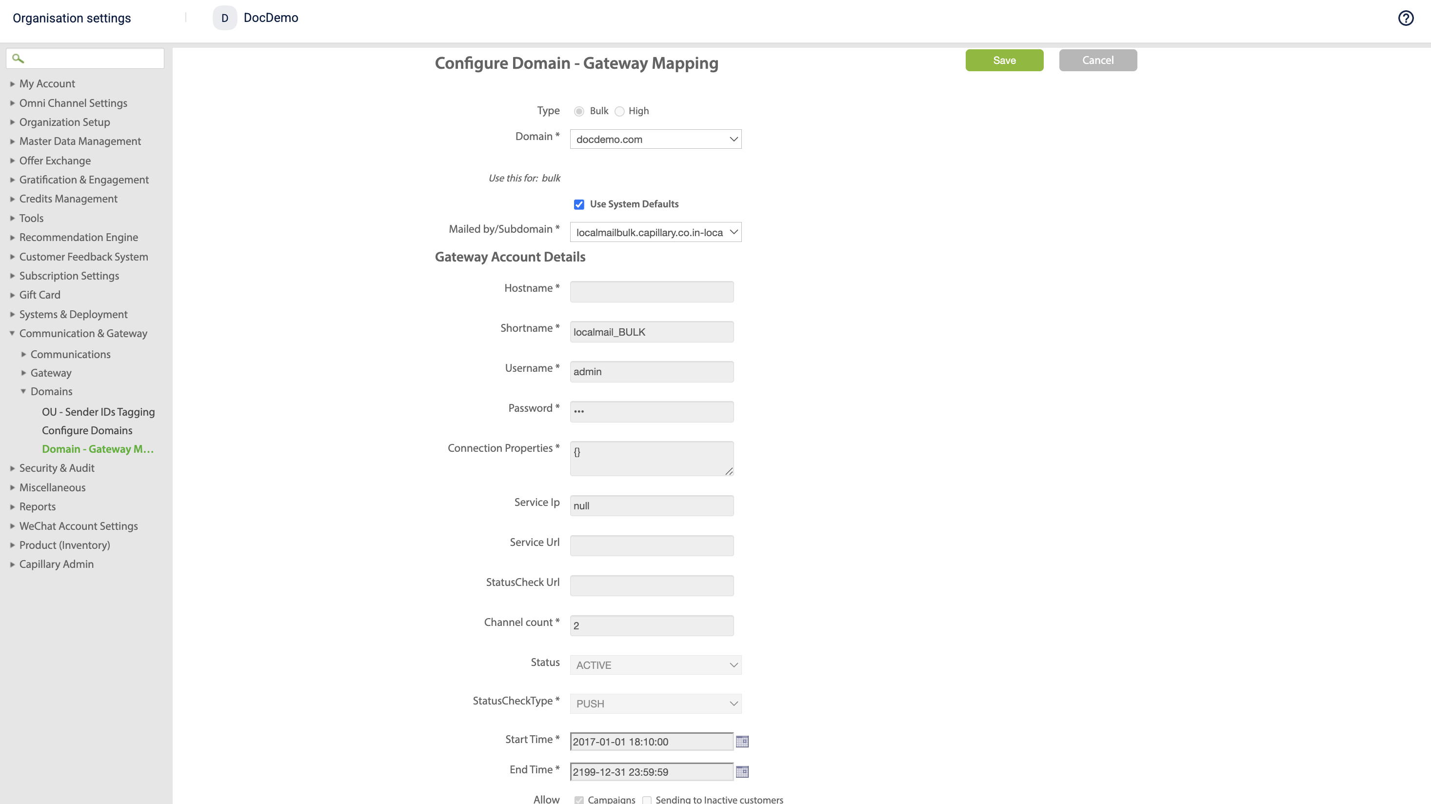 Domain | The default domain used in the system. For example, capillary.co.in, which is already configured in the Configure Domains section.. |