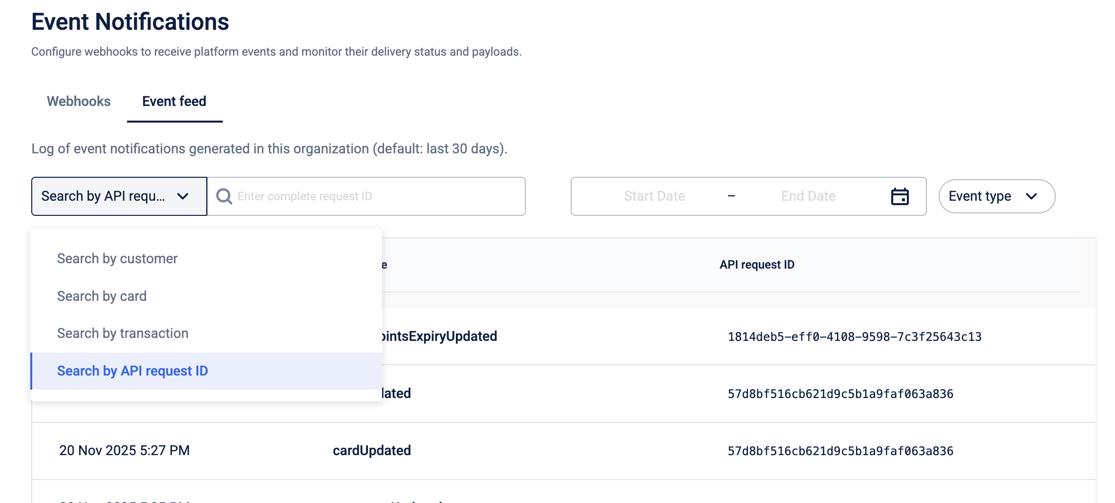 You can filter by either event type or search option, but not both at the same time. If you use the search option to look up a specific customer or identifier, the event type filter becomes inactive, and vice versa.
