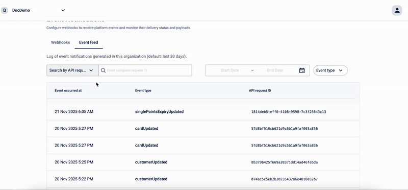 The Event feed page displays a log of all events generated within the organisation for all events over the last 30 days. Use this view to track event activity, monitor system behaviour, or troubleshoot event-based processes.