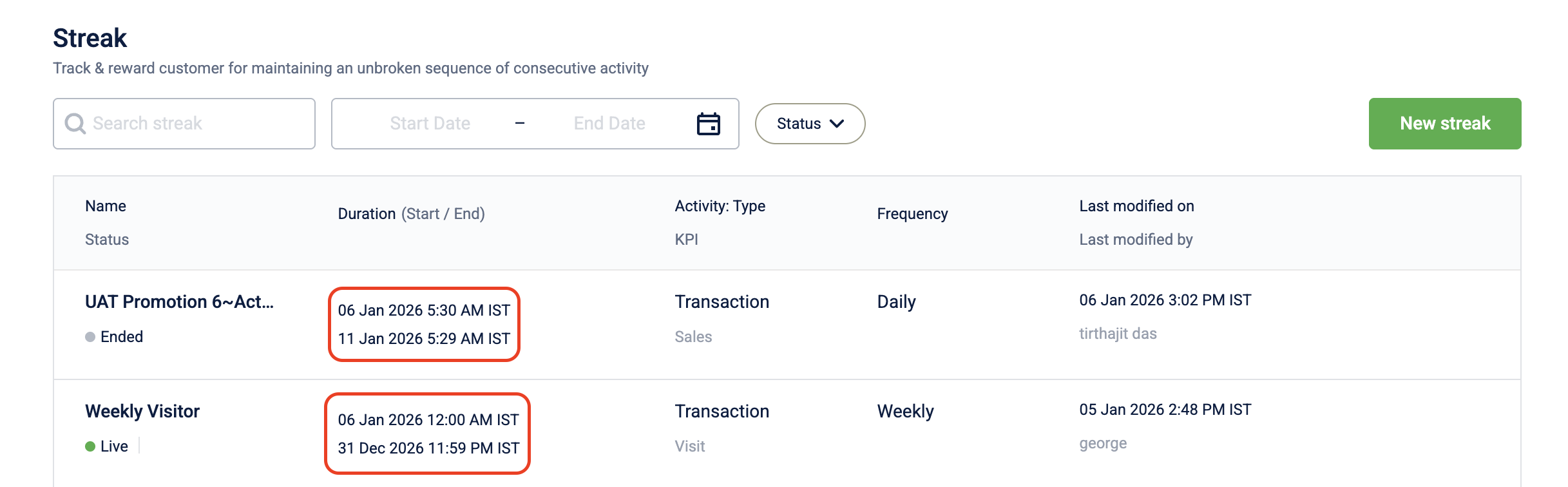 | Streaks | Creation & Listing | View Only | Organization Timezone |