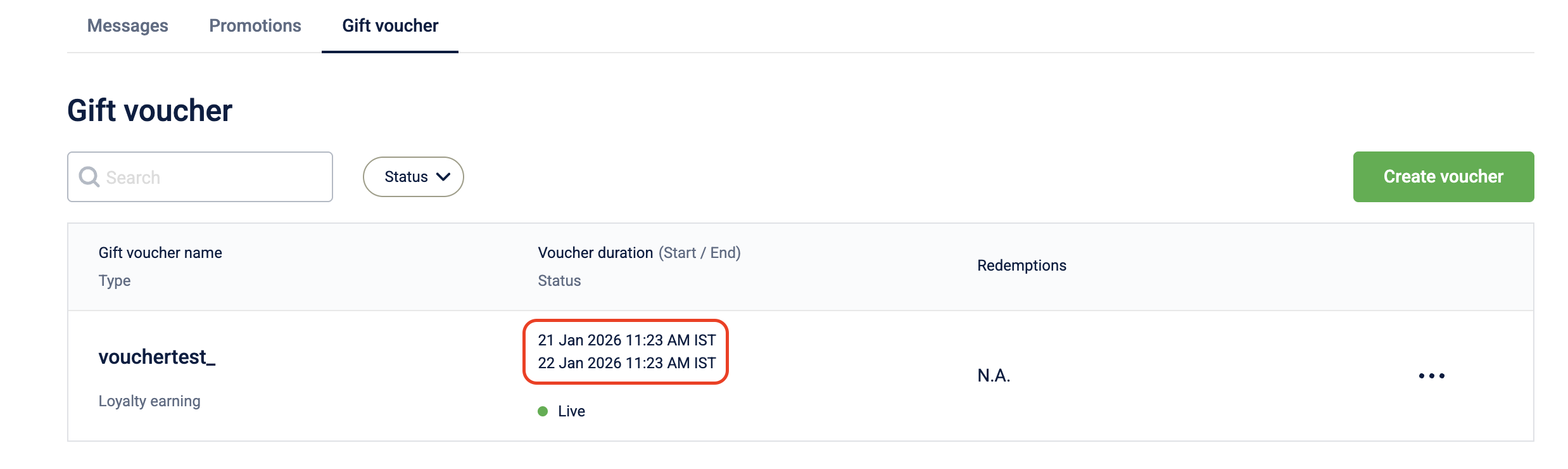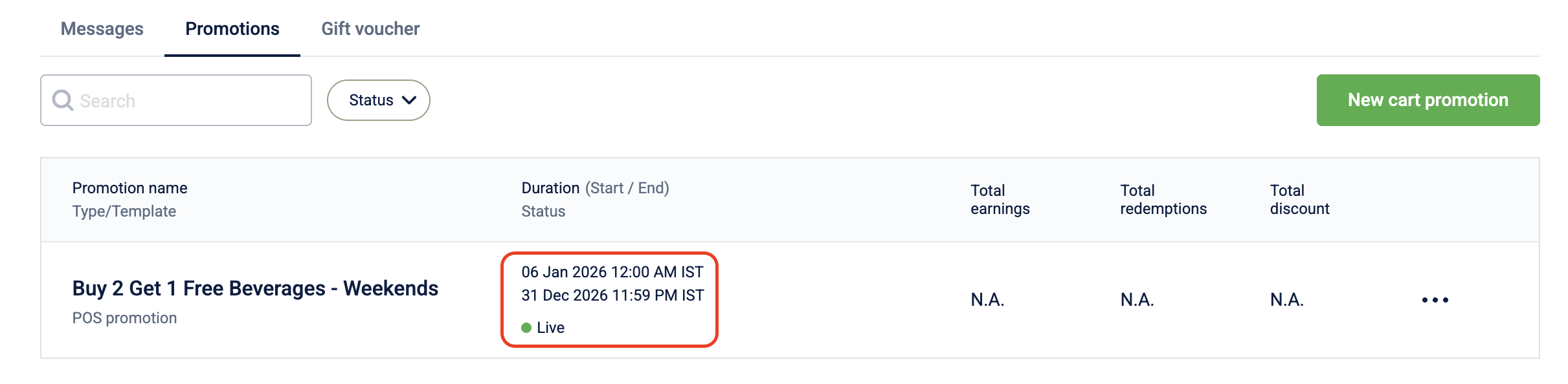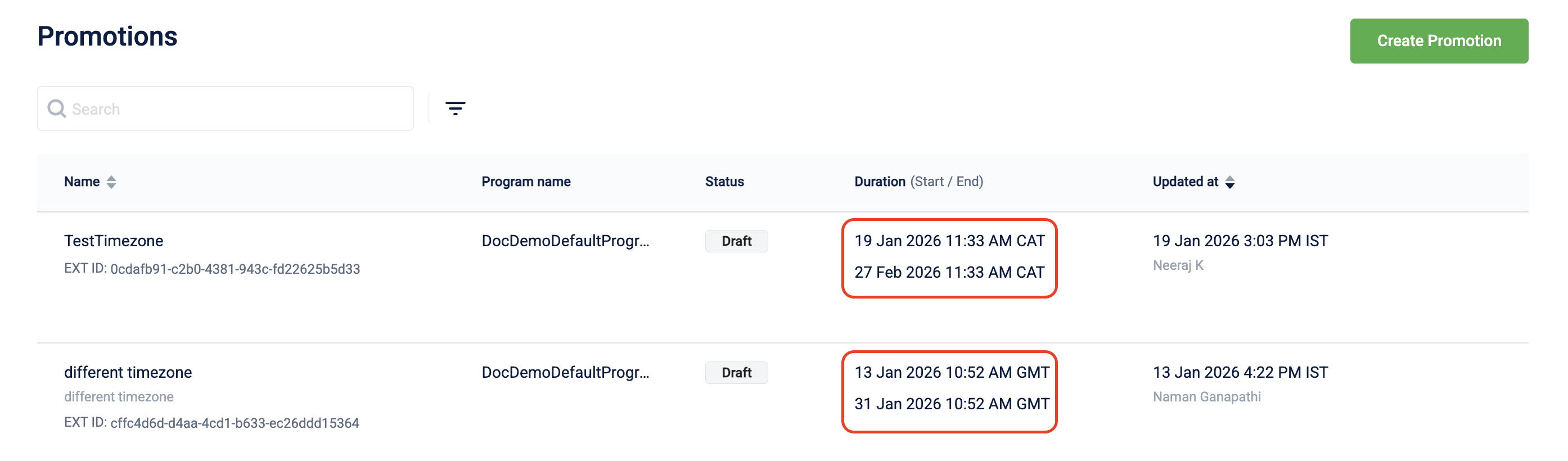 The promotion listing page displays date and time values for Duration in the timezone selected at the time of promotion creation, while date and time values for Updated at are displayed in the organization’s timezone, regardless of the timezone used during promotion creation.