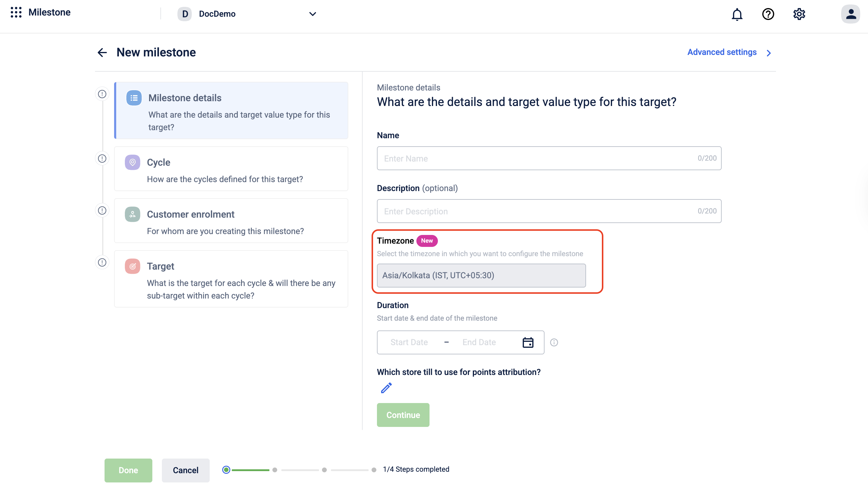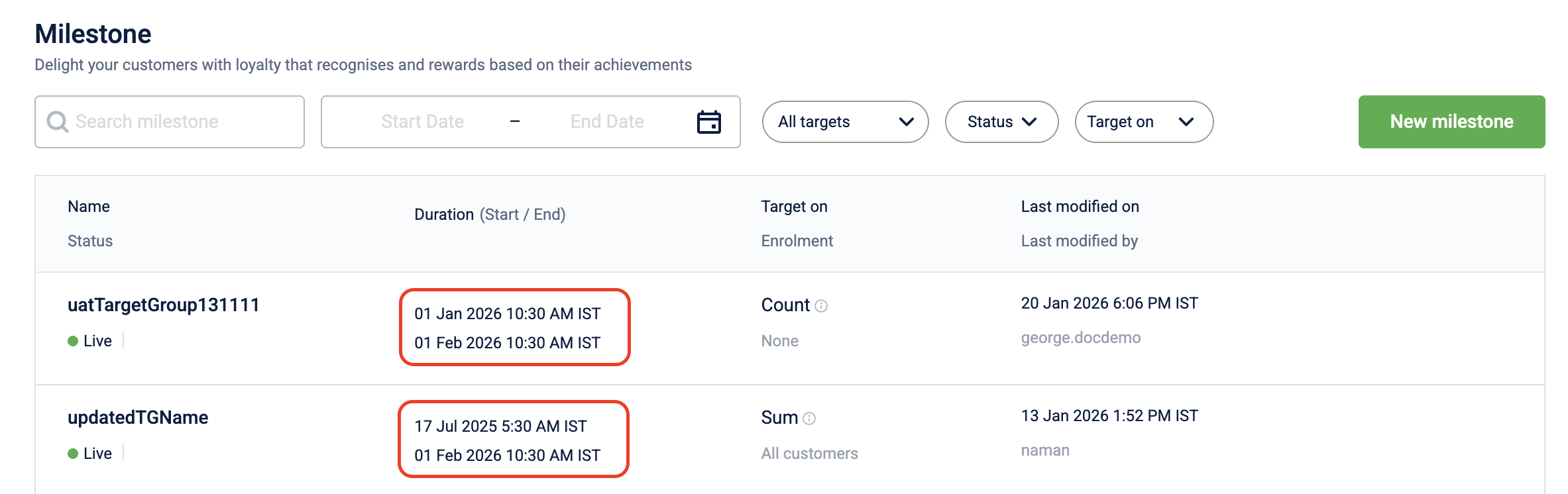 | Milestones | Creation & Listing | View Only | Organization Timezone |