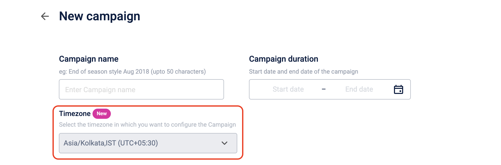 When you create a campaign, all date and time values use the organization base timezone. You cannot select a different timezone during creation.