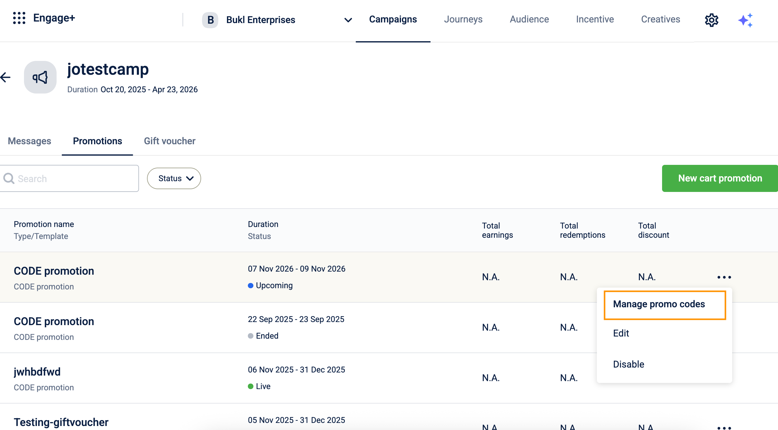 Note: At present, the API to fetch cart promotion codes for existing code linked cart promotion is not available, you can download the generated code list via the "Manage Promo Codes" settings on the cart promotions listing page in the UI.